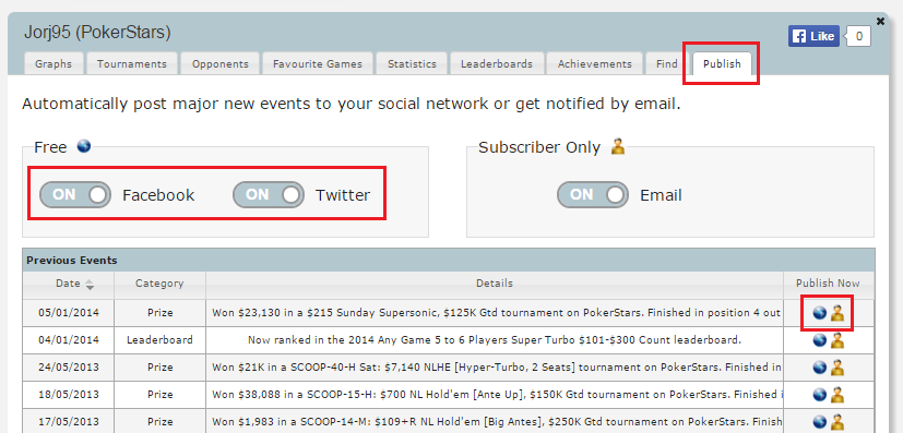 El sistema automatizado de publicación te permite publicar automáticamente o manualmente en tus timelines los principales eventos, tales como victorias, logros, posiciones en la clasificación y recibir notificaciones por email.